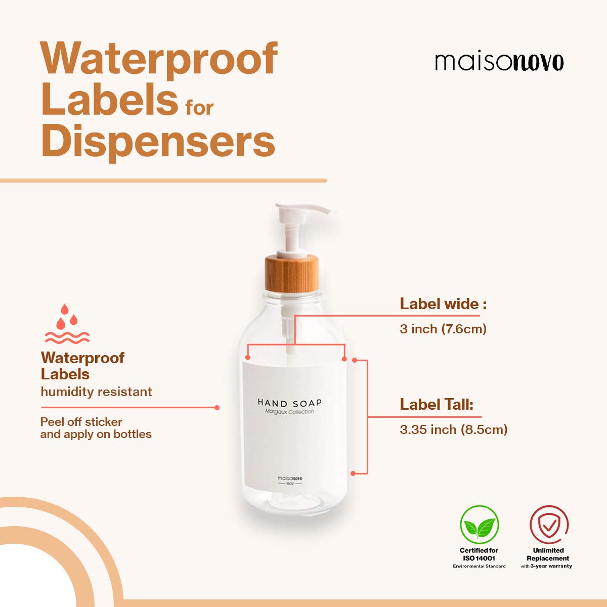 MaisoNovo Margaux Waterproof Labels for Plastic Bottles - 3.0"x3.35" Organization Labels for Kitchen & Bathroom - Hand Sanitizer Pack 6 Pieces